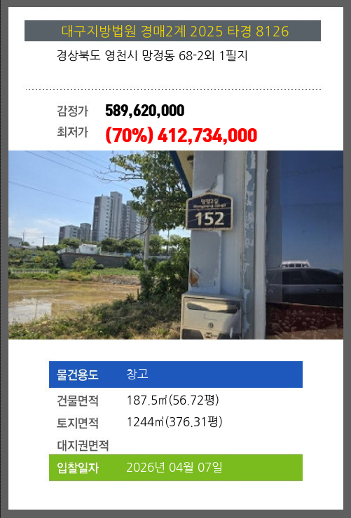 영천창고경매 영천시 망정동 68-2외 1필지 №2025 타경 8126