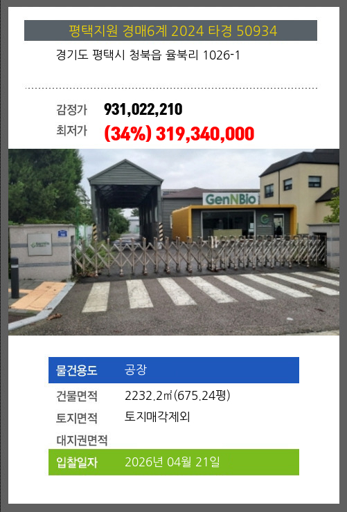 | 용도 | 공장 | 채권자 | 김** | 감정가 | 931,022,210 |