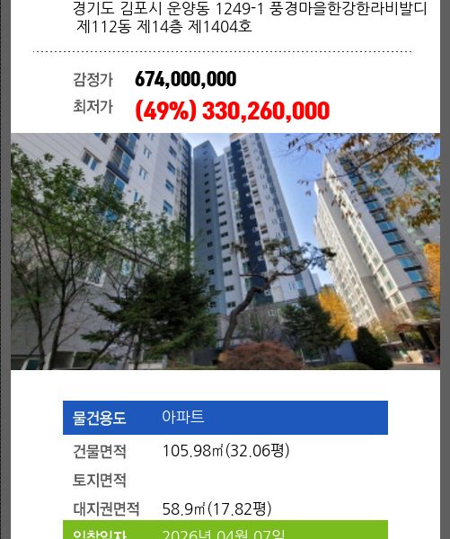 본건은 경기도 김포시 운양동 1301-1 한강신도시롯데캐슬 제301동 제6층 제601호