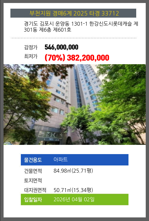 김포아파트경매 김포시 운양동 1301-1 한강신도시롯데캐슬 제301동 제6층 제601호 №2025 타경 33712