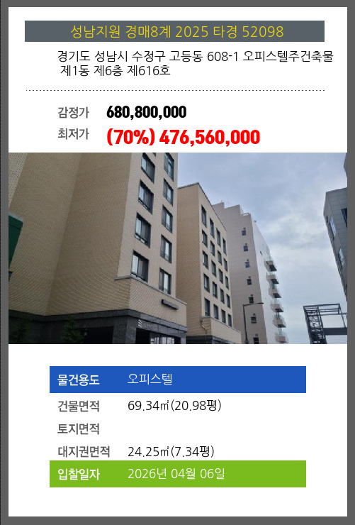 본건은 경기도 성남시 수정구 고등동 608-1 오피스텔주건축물 제1동 제6층 제616호