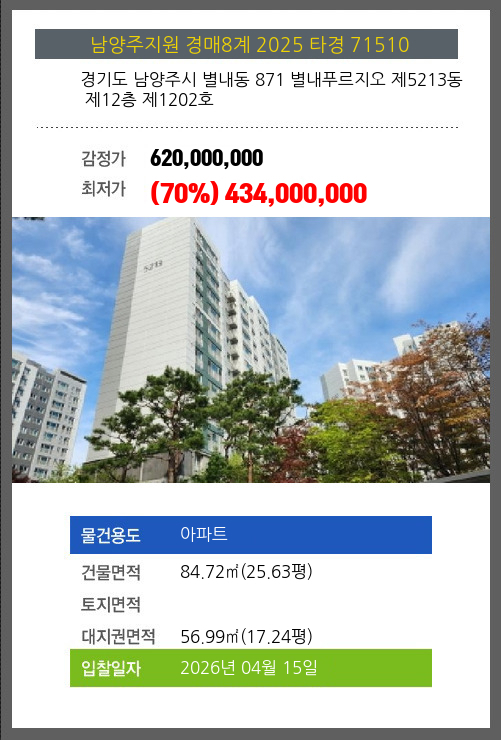 남양주아파트경매 남양주시 별내동 871 별내푸르지오 제5213동 제12층 제1202호 №2025 타경 71510