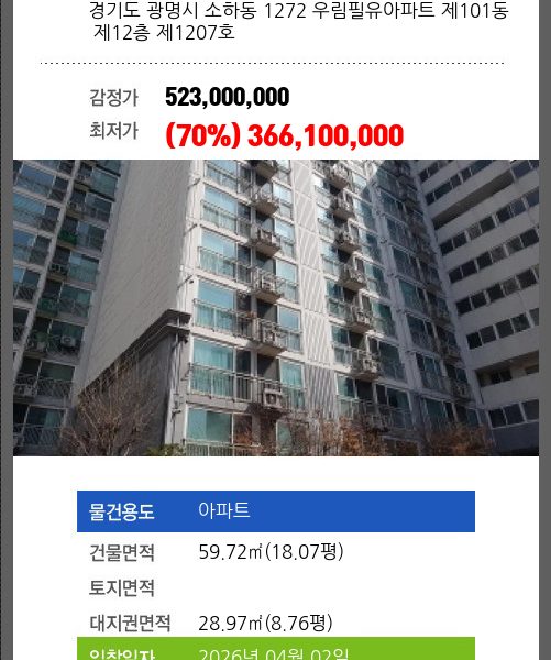 | 건물면적 | 59.97㎡ (18.14평) | 채무자 | 권**외1명 | 최저가 | (70%) 445,900,000 |