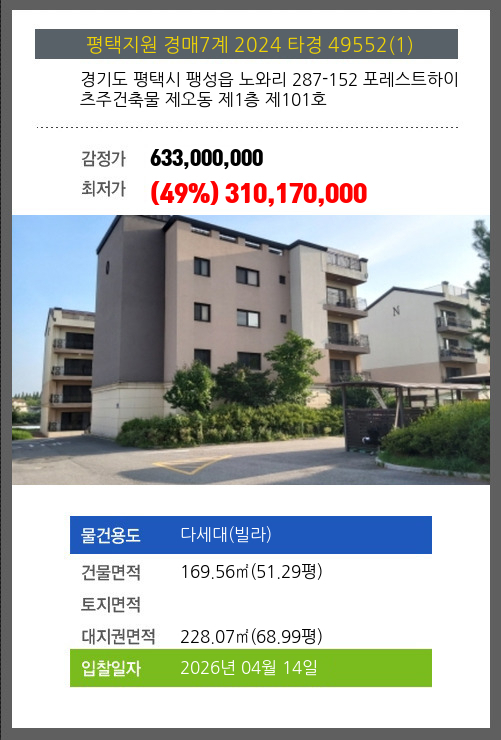 평택빌라경매 평택시 팽성읍 노와리 287-152 포레스트하이츠주건축물 제오동 제1층 제101호 №2024 타경 49552(1)