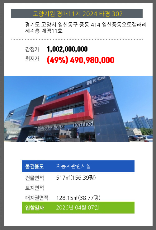 본건은 경기도 고양시 일산동구 풍동 414 일산풍동오토갤러리 제지층 제엠11호