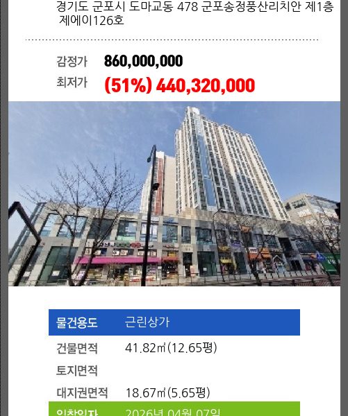건물면적 41.82㎡ (12.65평) 채무자 ㈜** 최저가 (51%) 440,320,000