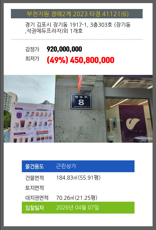 김포상가경매 김포시 장기동 1917-1, 3층303호 장기동,석권에듀프라자외 1개호 №2023 타경 41121(6)