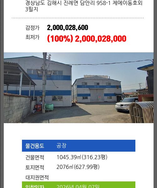 | 건물면적 | 705.28㎡ (213.35평) | 채무자 | ㈜**외1명 | 최저가 | (56%) 1,251,450,000 |