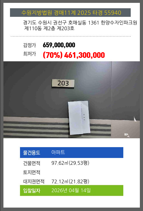 본건은 경기도 수원시 권선구 호매실동 1361 한양수자인파크원 제110동 제2층 제203호