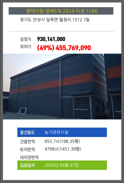건물면적 655.7㎡ (198.35평) 채무자 농** 최저가 (49%) 455,769,090