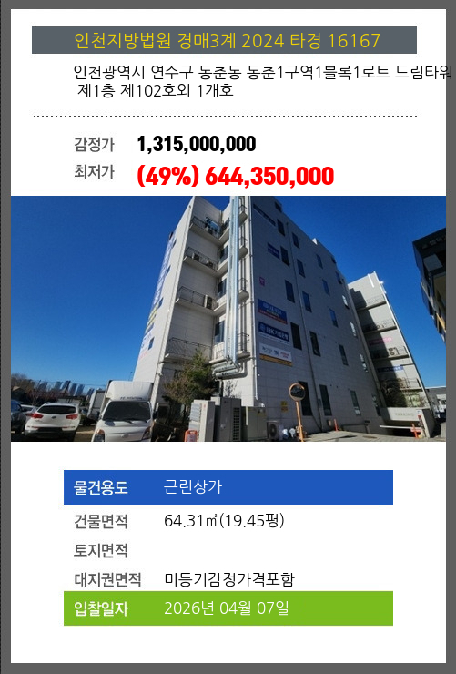 본건은 인천광역시 연수구 동춘동 동춘1구역1블록1로트 드림타워 제1층 제102호외 1개호