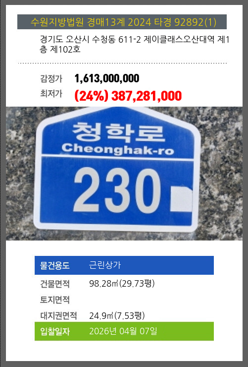 본건은 경기도 오산시 수청동 611-2 제이클래스오산대역 제1층 제102호
