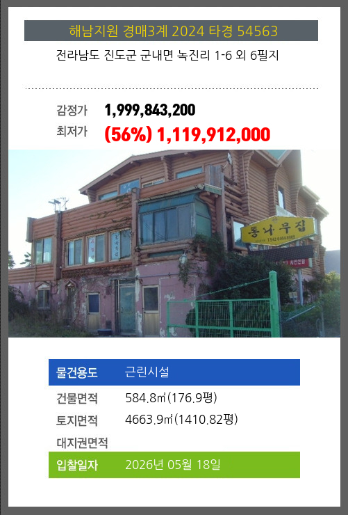 | 소재지 | [지번] 전라남도 진도군 군내면 녹진리 1-6 외 6필지 [도로명 주소] 전라남도 진도군 군내면 진도대로 8459-18 외 6필지 |
