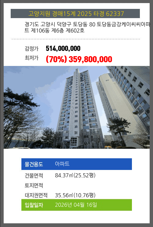 본건은 경기도 고양시 덕양구 토당동 80 토당동금강케이씨씨아파트 제106동 제6층 제602호