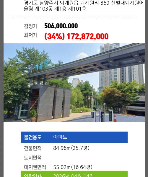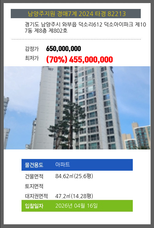 | 건물면적 | 84.62㎡ (25.6평) | 채무자 | 김** | 최저가 | (70%) 455,000,000 |