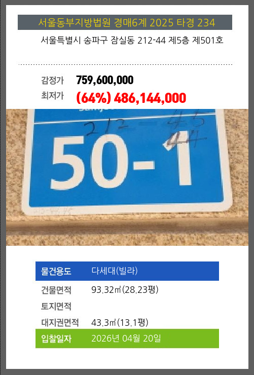 본건은 서울특별시 송파구 잠실동 212-44 제5층 제501호