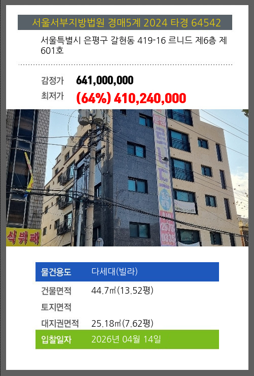 은평빌라경매 은평구 갈현동 419-16 르니드 제6층 제601호 №2024 타경 64542