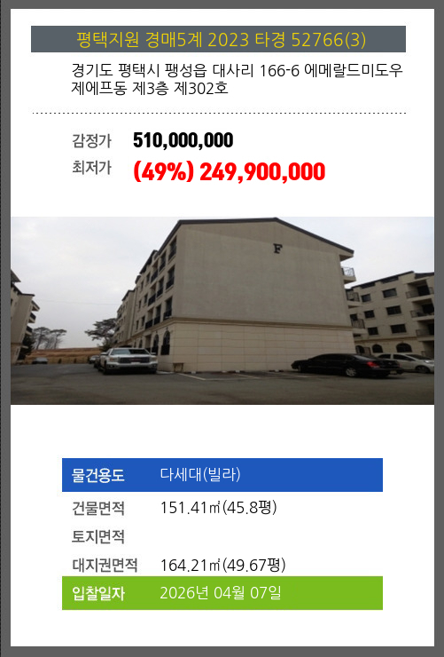 본건은 경기도 평택시 팽성읍 대사리 166-6 에메랄드미도우 제에프동 제3층 제302호