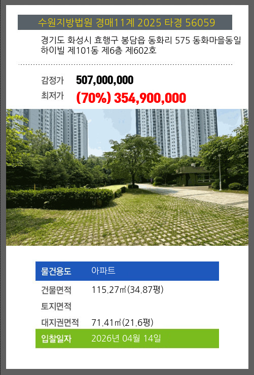 본건은 경기도 화성시 효행구 봉담읍 동화리 575 동화마을동일하이빌 제101동 제6층 제602호