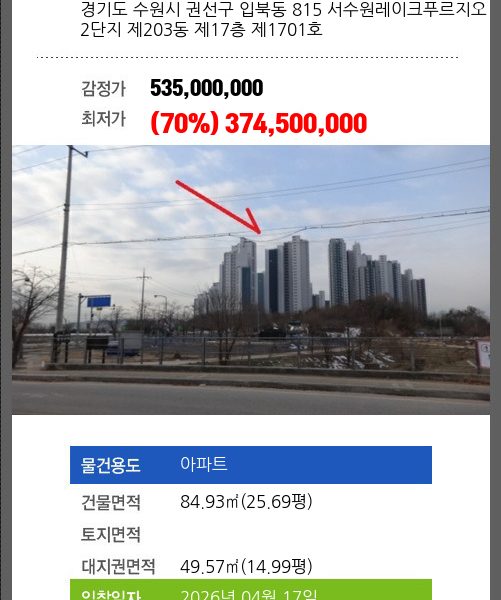 | 건물면적 | 115.27㎡ (34.87평) | 채무자 | 정** | 최저가 | (70%) 354,900,000 |