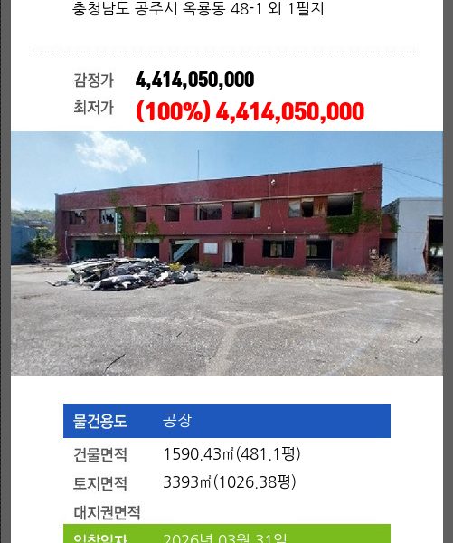 | 용도 | 공장 | 채권자 | 에** | 감정가 | 1,461,615,000 |