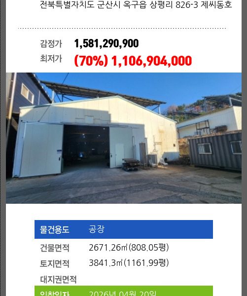 | 용도 | 공장 | 채권자 | 신**외1명 | 감정가 | 1,155,870,340 |