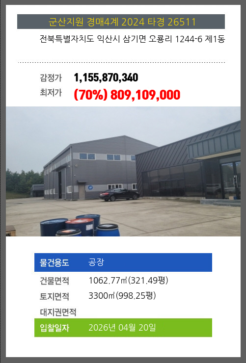 | 건물면적 | 1062.77㎡ (321.49평) | 채무자 | 유** | 최저가 | (70%) 809,109,000 |