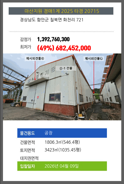 | 건물면적 | 1806.3㎡ (546.4평) | 채무자 | 차** | 최저가 | (49%) 682,452,000 |