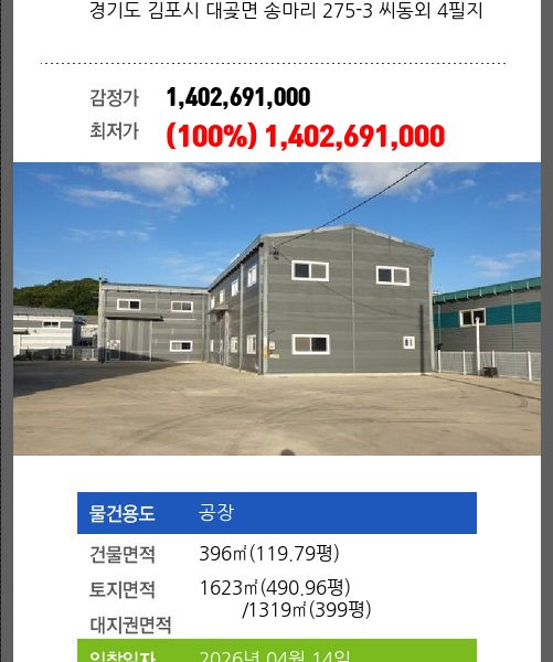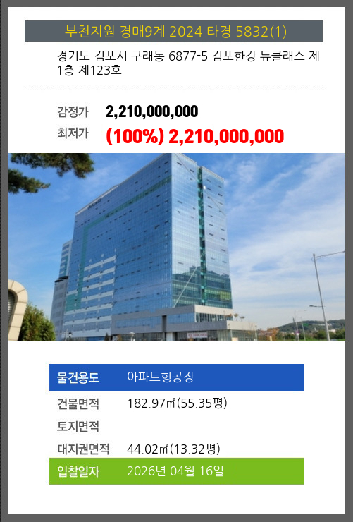 | 용도 | 아파트형공장 | 채권자 | 농** | 감정가 | 2,210,000,000 |