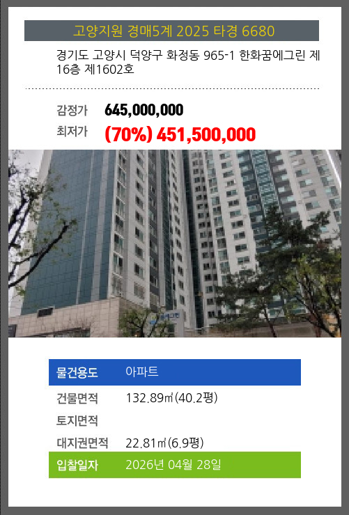 고양아파트경매 고양시 덕양구 화정동 965-1 한화꿈에그린 제16층 제1602호 №2025 타경 6680