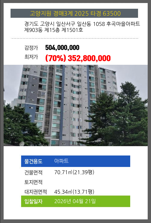고양아파트경매 고양시 일산서구 일산동 1058 후곡마을아파트 제903동 제15층 제1501호 №2025 타경 63500