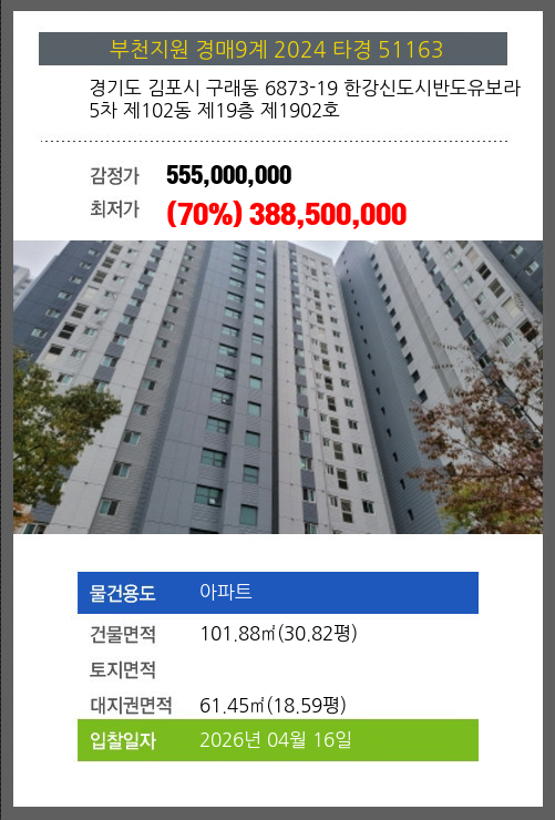 김포아파트경매 김포시 구래동 6873-19 한강신도시반도유보라5차 제102동 제19층 제1902호 №2024 타경 51163