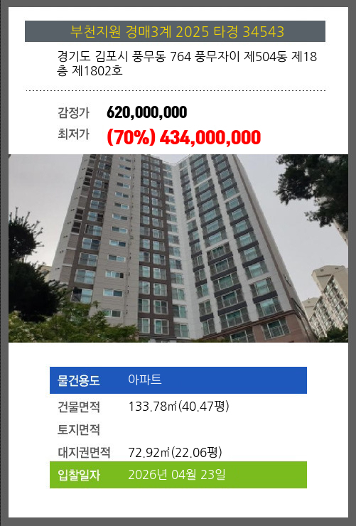 | 대지권 | 72.92㎡ (22.06평) | 소유자 | 이** | 보증금 | (10%) 43,400,000 |