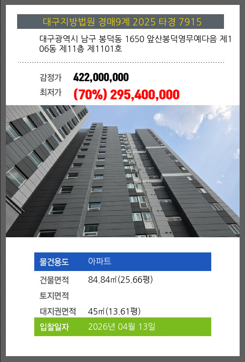 본건은 대구광역시 남구 봉덕동 1650 앞산봉덕영무예다음 제106동 제11층 제1101호