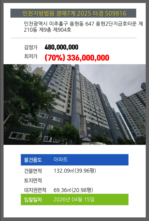 미추홀아파트경매 미추홀구 용현동 647 용현2단지금호타운 제210동 제9층 제904호 №2025 타경 509816