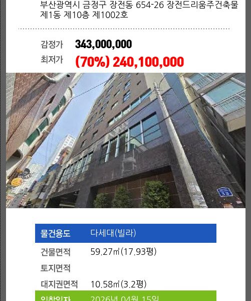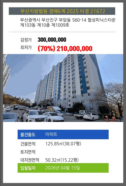 | 매각대상 | 공시가격1~2억 | 경매종류 | 임의경매 | 사건접수일 | 2025-03-21 |