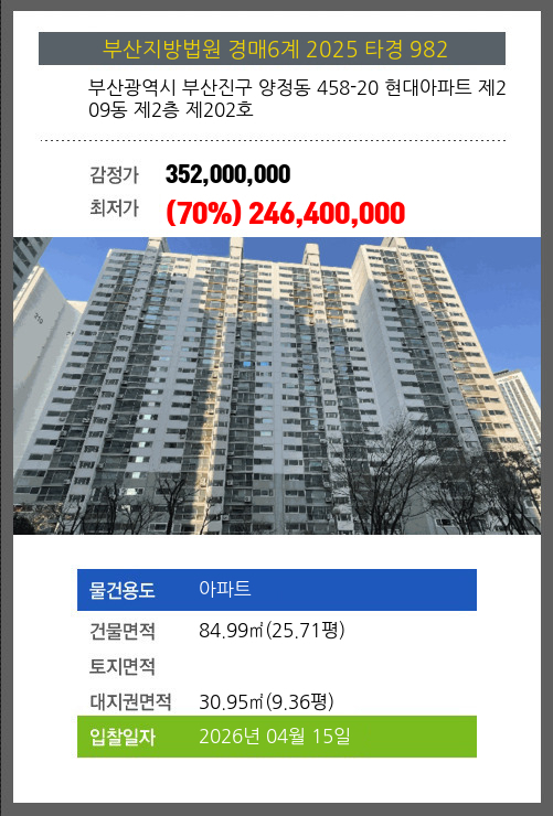 본건은 부산광역시 부산진구 양정동 458-20 현대아파트 제209동 제2층 제202호