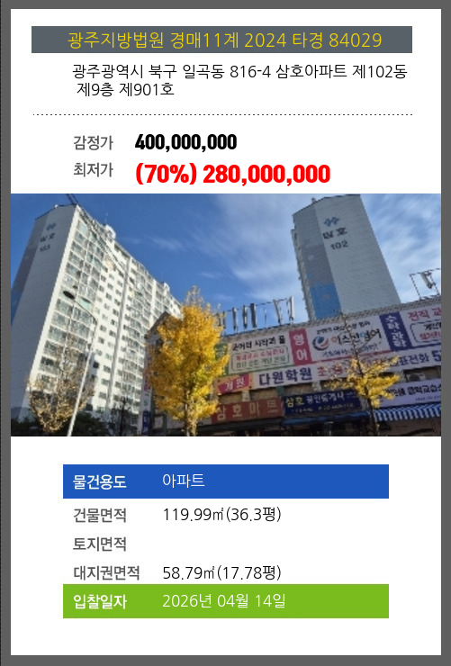 본건은 광주광역시 북구 일곡동 816-4 삼호아파트 제102동 제9층 제901호