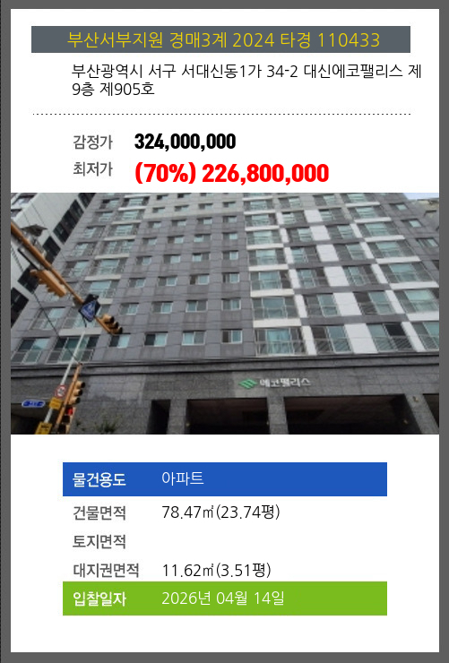 서아파트경매 서구 서대신동1가 34-2 대신에코팰리스 제9층 제905호 №2024 타경 110433