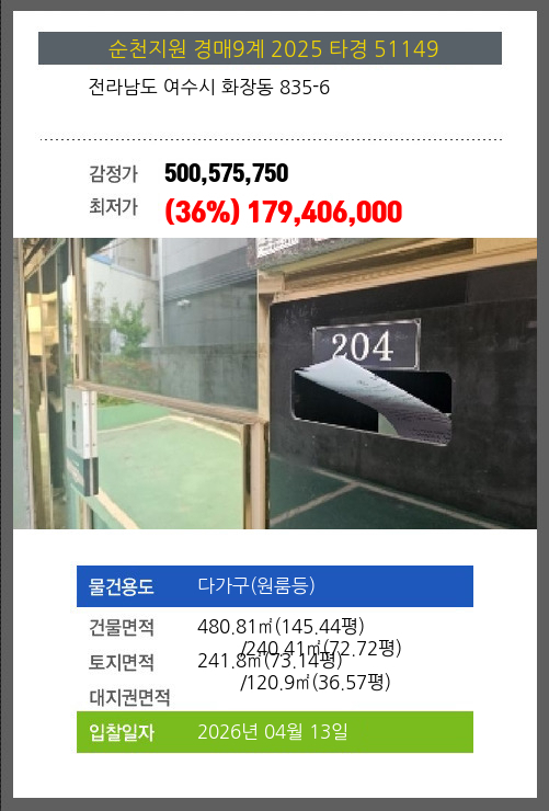 | 토지면적 | 전체:241.8㎡ (73.14평) 매각지분:120.9㎡ (36.57평) |