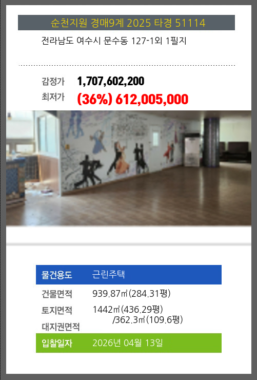 | 토지면적 | 전체:1442㎡ (436.29평) 매각지분:362.3㎡ (109.6평) |