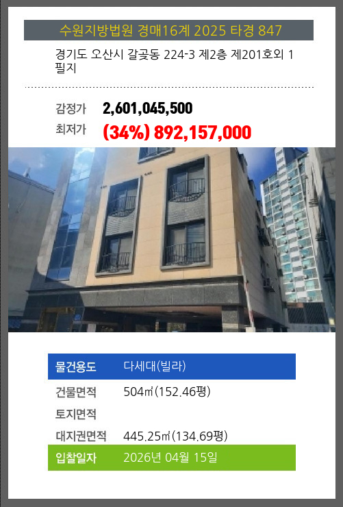 본건은 경기도 오산시 갈곶동 224-3 제2층 제201호외 1필지