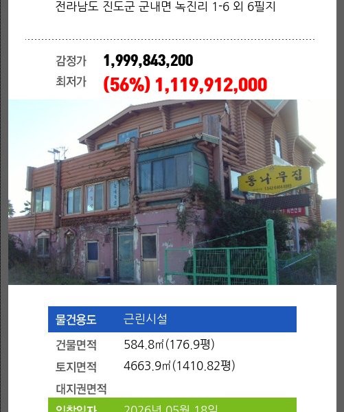 | 건물면적 | 581.86㎡ (176.01평) | 채무자 | 김** | 최저가 | (36%) 189,873,000 |