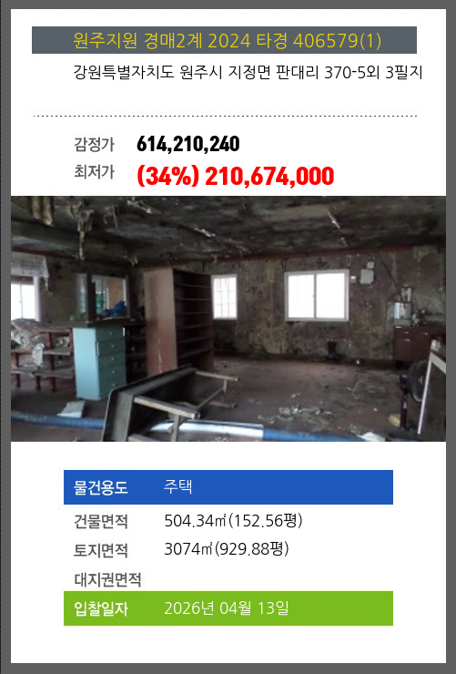 | 소재지 | [지번] 강원특별자치도 원주시 지정면 판대리 370-5외 3필지 [도로명 주소] 강원도 원주시 지정면 구재로 40-48외 3필지 |