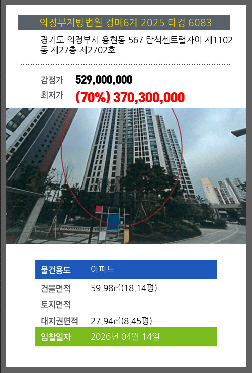 의정부아파트경매 의정부시 용현동 567 탑석센트럴자이 제1102동 제27층 제2702호 №2025 타경 6083