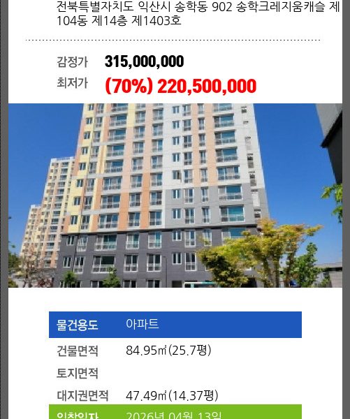 | 소재지 | [지번] 전북특별자치도 익산시 송학동 902 송학크레지움캐슬 제102동 제14층 제1402호 [도로명 주소] 전라북도 익산시 학곤로16길 52-16 송학크레지움캐슬 제102동 제14층 제1402호 |