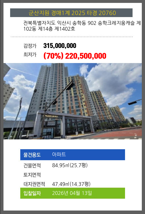본건은 전북특별자치도 익산시 송학동 902 송학크레지움캐슬 제102동 제14층 제1402호