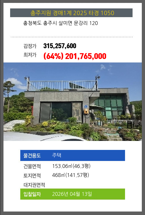 | 건물면적 | 153.06㎡ (46.3평) | 채무자 | 김** | 최저가 | (64%) 201,765,000 |