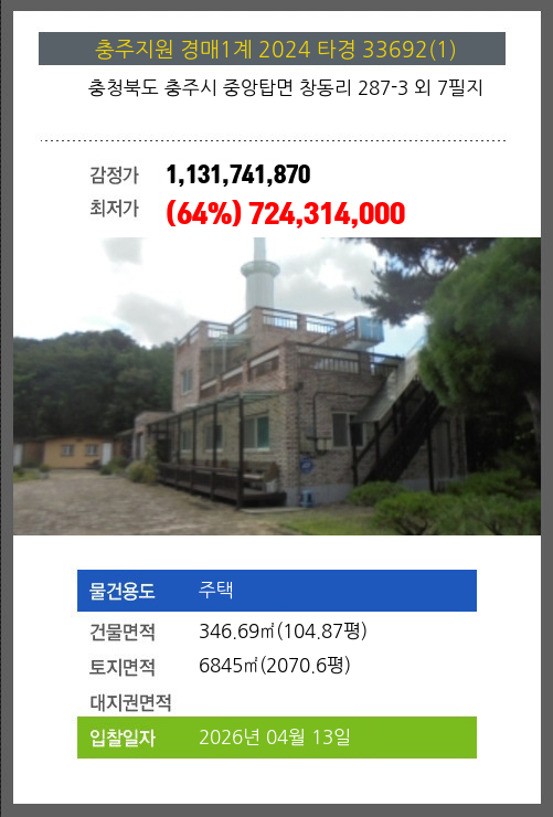 | 용도 | 주택 | 채권자 | 충**외1명 | 감정가 | 1,131,741,870 |