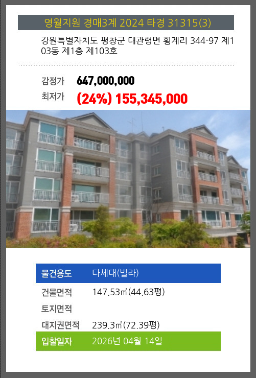 평창빌라경매 평창군 대관령면 횡계리 344-97 제103동 제1층 제103호 №2024 타경 31315(3)